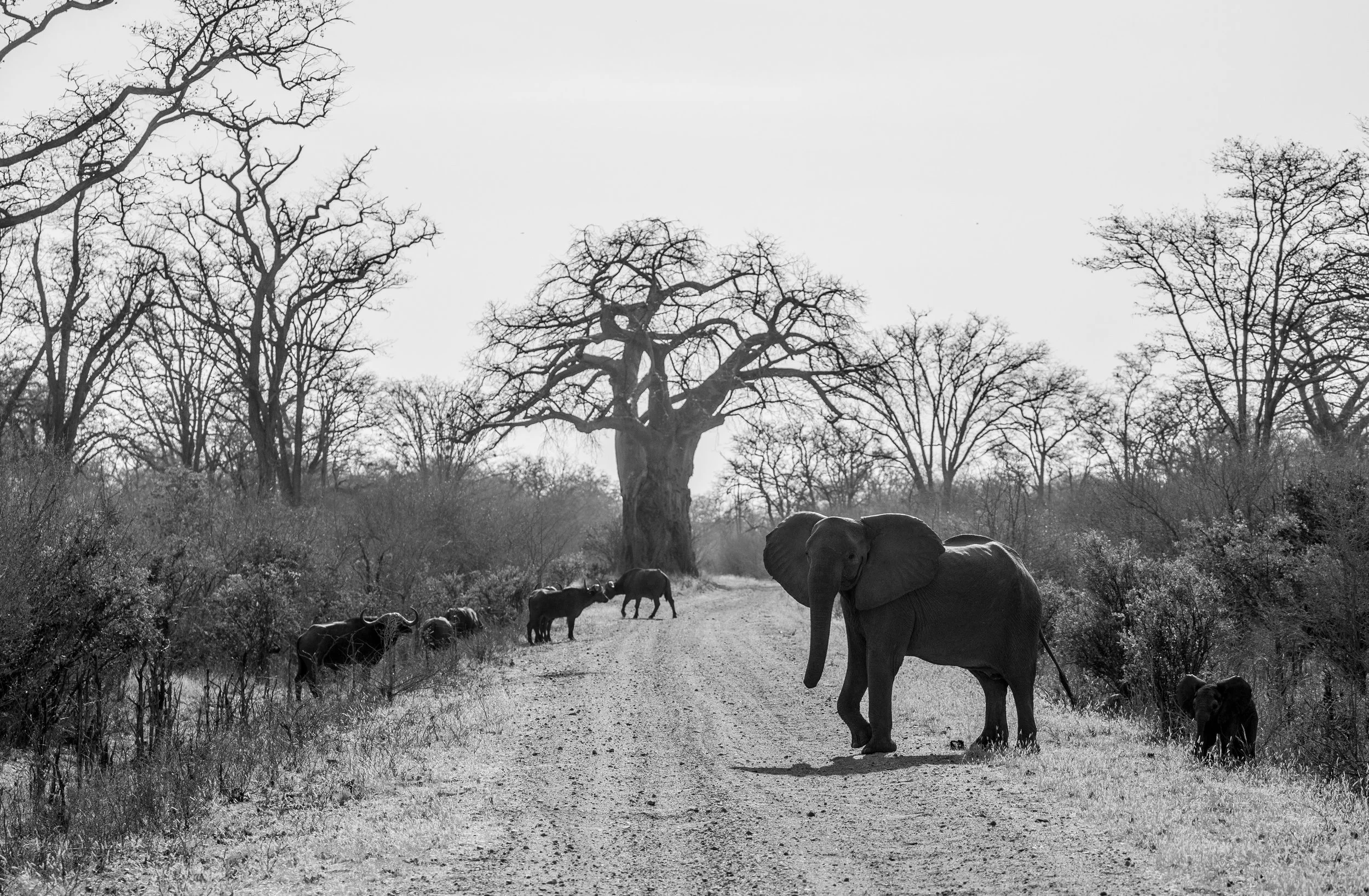Silhouette of Baobab, elephant and buffalo herd at Moremi, Botswana. B&W